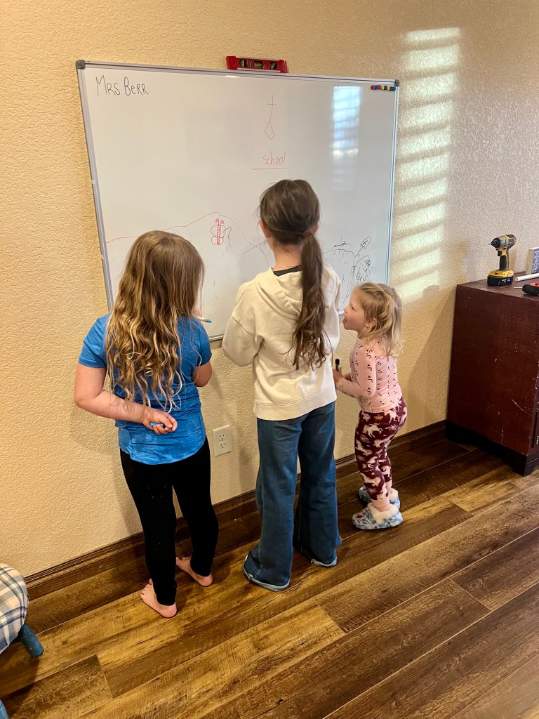 We take a break, sit down and talk about what is bothering everyone as we try to dry up the tears. Ella didn’t realize homeschool was going to be so serious. She thought it would be playtime and more cuddle time with mama, she didn’t think there would be time restrictions and that I would make us do “serious” school. Next I ask Jojo why she is upset. She explains she had been excited about homeschool and was doing her best to stay positive, but when our first few minutes of homeschool began, she realized this was actually happening and it became clear she wouldn’t be going back to “real” school. So we talked through everything, and said a prayer together. Ella got to run upstairs and grab her backpack, and we began where we left off. I kept my courage up as much as possible and praise the Lord our day began again, this time much smoother, as we talked about how homeschool would look going forward. I’m proud to report, after 4 weeks, we have not had anymore tearful outbursts and the girls have both spontaneously told me they are loving school at home. They still have moments of missing public school and friends, but I think they are starting to see how fun this new journey together can be.